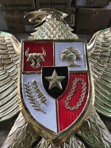 Produk dibuat dari bahan tembaga maupun kuningan yang dikenal sangat kuat dan tahan terhadap korosi serta perubahan cuaca ekstrem. Dengan perawatan mudah, lambang ini dapat bertahan puluhan tahun tanpa kehilangan kilau dan keindahannya.Detail dan Presisi Tinggi