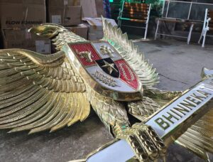 Burung Garuda menggambarkan kekuatan, keberanian, dan semangat bangsa Indonesia. Warna kuningan yang mengilap melambangkan kemegahan dan keagungan negara. Lambang ini tidak hanya menjadi dekorasi, tetapi juga simbol kedaulatan dan persatuan bangsa.Ramah Lingkungan